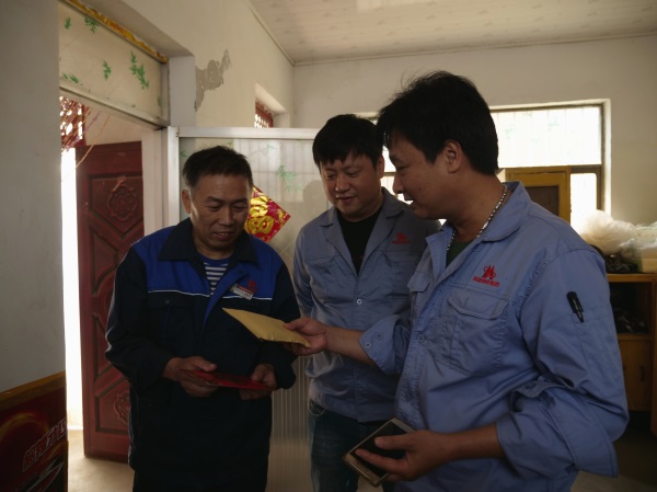 到達(dá)趙衛(wèi)星家中后,鄭林偉和劉瑞棋向趙衛(wèi)星的父母表示親切問(wèn)候,詢問(wèn)了趙衛(wèi)星父母的病情,并祝愿他們?cè)缛湛祻?fù),隨后為他們送上公司關(guān)愛基金5000元以及質(zhì)檢部全體員工的愛心捐款4065元。