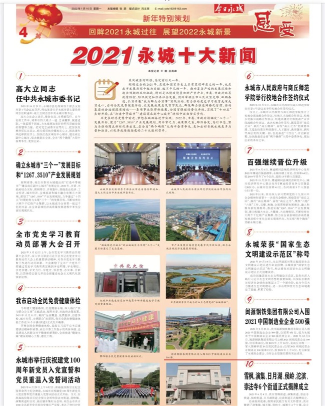 元月9日,《今日永城》發(fā)布了《2021永城十大新聞》,閩源鋼鐵集團有限公司入圍2021中國制造業(yè)企業(yè)500強,位居第451位,成為永城首個中國制造業(yè)企業(yè)500強民營企業(yè)被選為2021永城十大新聞之一。